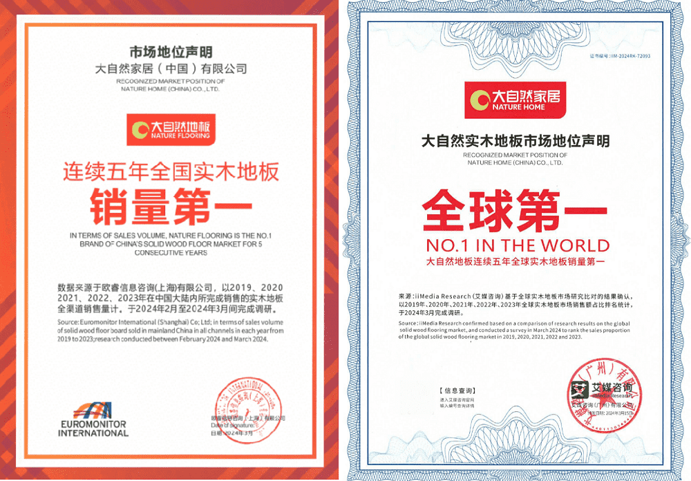 大自然家居全球布局9大原材料供應基地和6大集約化智造基地,為未來地板、木門、櫥柜、衣柜以及整家定制等產品的產能做出了精心布局,投入集約化、智能化、自動化、信息化的高水平生產基地的建設,助推中國健康家居行業的發展。2024年3月,全球優秀的權威機構歐睿咨詢和艾媒咨詢分別發布統計數據,表明大自然實木地板在2019年至2023年連續五年蟬聯“全國實木地板銷量第一”和“全球實木地板銷量第一”的榮譽,展現了大自然家居在國內外市場的強勁實力。