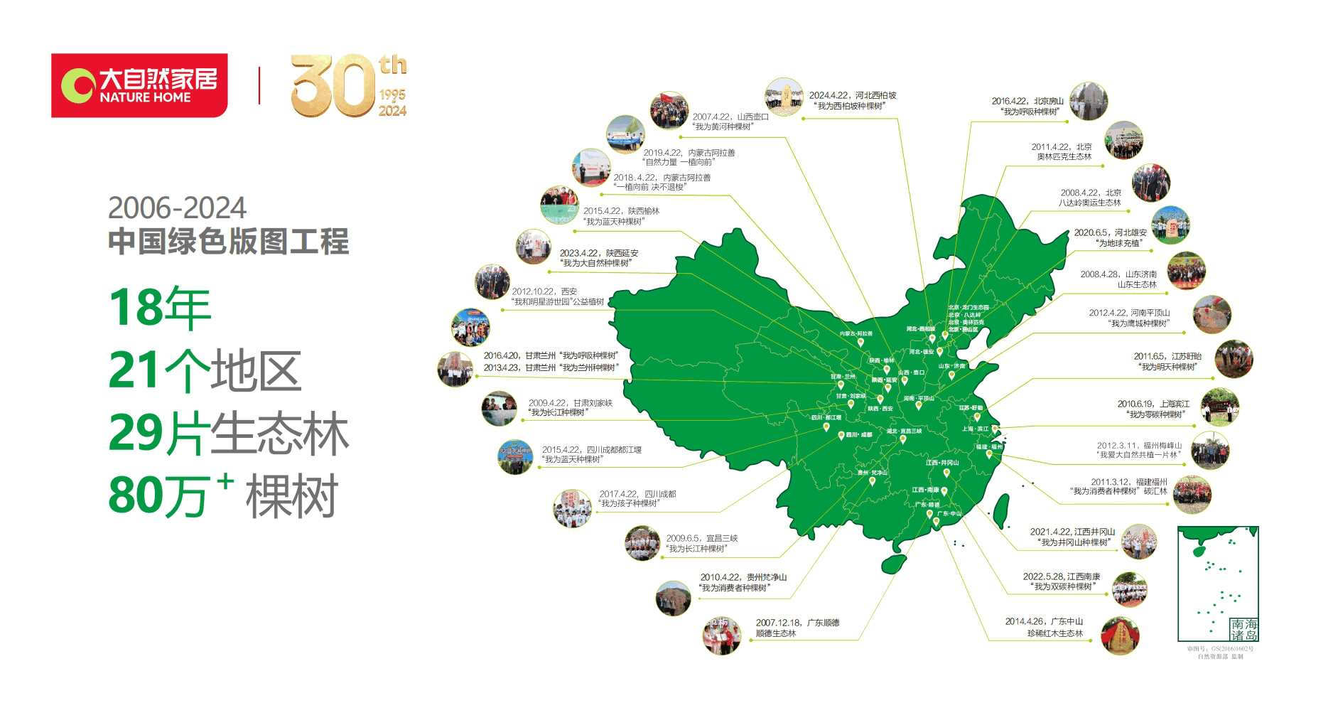 4月22日,大自然家居攜手中國綠化基金會在河北西柏坡舉辦以“我為西柏坡種棵樹”為主題的公益植樹活動。當紀念碑上的紅布被緩緩揭開時,一片面積達100畝的生態公益林正式亮相。這標志著大自然家居自2006年推出的“中國綠色版圖工程”邁出了第18步,也彰顯了其在環保領域的不懈努力。多年來,這一公益事業備受社會各界矚目,吸引越來越多的人投身環保事業。在“擔環保責任、譜健康生活、做健康家居”的企業使命的指引下,大自然家居已在國內外21個地區種植了29片生態林,開辟了一條具有獨特特色的公益植樹之路。
