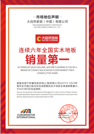 歐睿咨詢作為全球領先的權威市場調研機構,其數據以高度公信力享譽行業。據歐睿最新數據顯示,大自然家居實木地板連續六年穩居“全國實木地板銷量第一”。這一成績,是大自然家居強大的產品力與市場競爭力的表現,更印證其在消費者心中的卓越口碑。