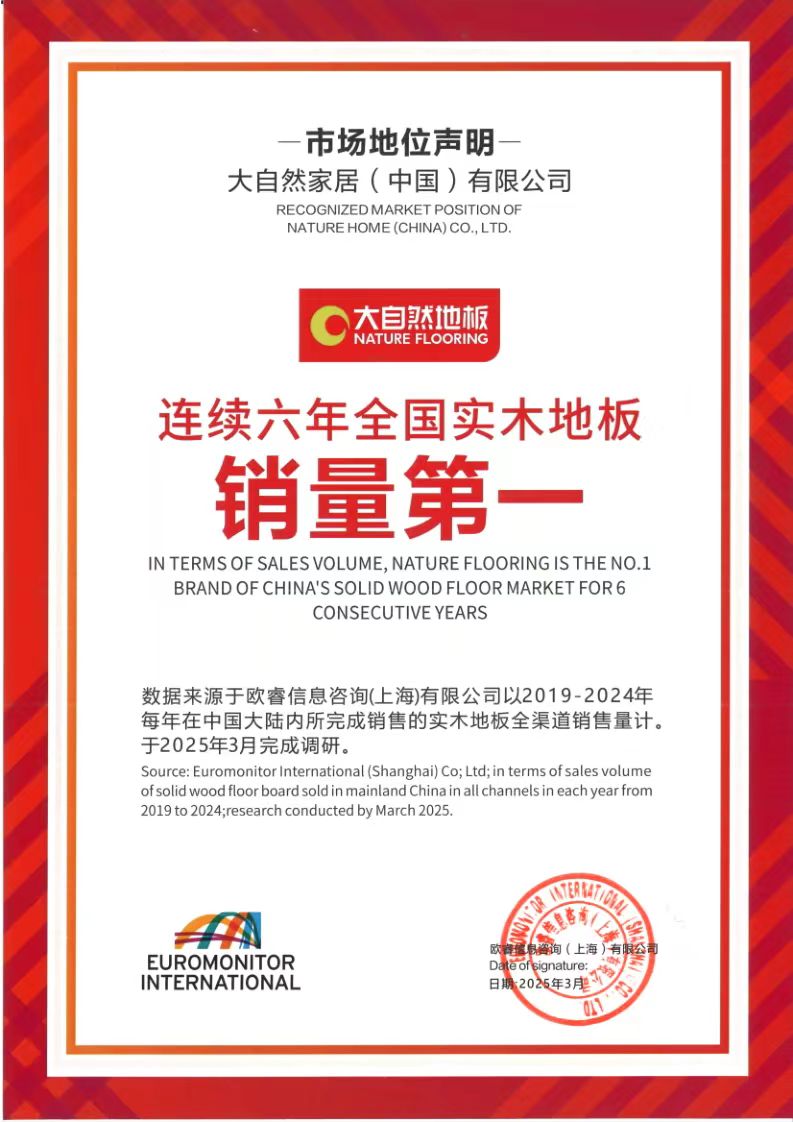 根據市場權威數據印證了這一戰略成效:歐睿國際2024年度報告顯示,大自然實木地板連續6年(2019-2024)榮膺“全國實木地板銷量第一”和“全球實木地板銷量第一”的榮譽,這一成就詮釋了商業價值與生態價值協同共生的典范。
