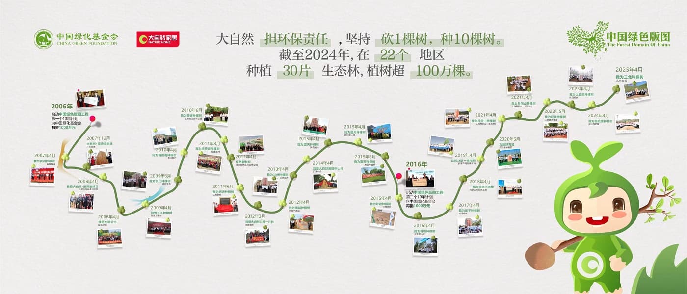 自“中國綠色版圖”工程啟動以來,大自然家居董事長佘學彬提出的“砍一棵樹,種10棵樹”理念在20年間持續踐行,以長期堅守為指引,積極推動行業走向商業向善的可持續發展道路,并帶動更多人加入守護環境、共創綠色未來的行列。