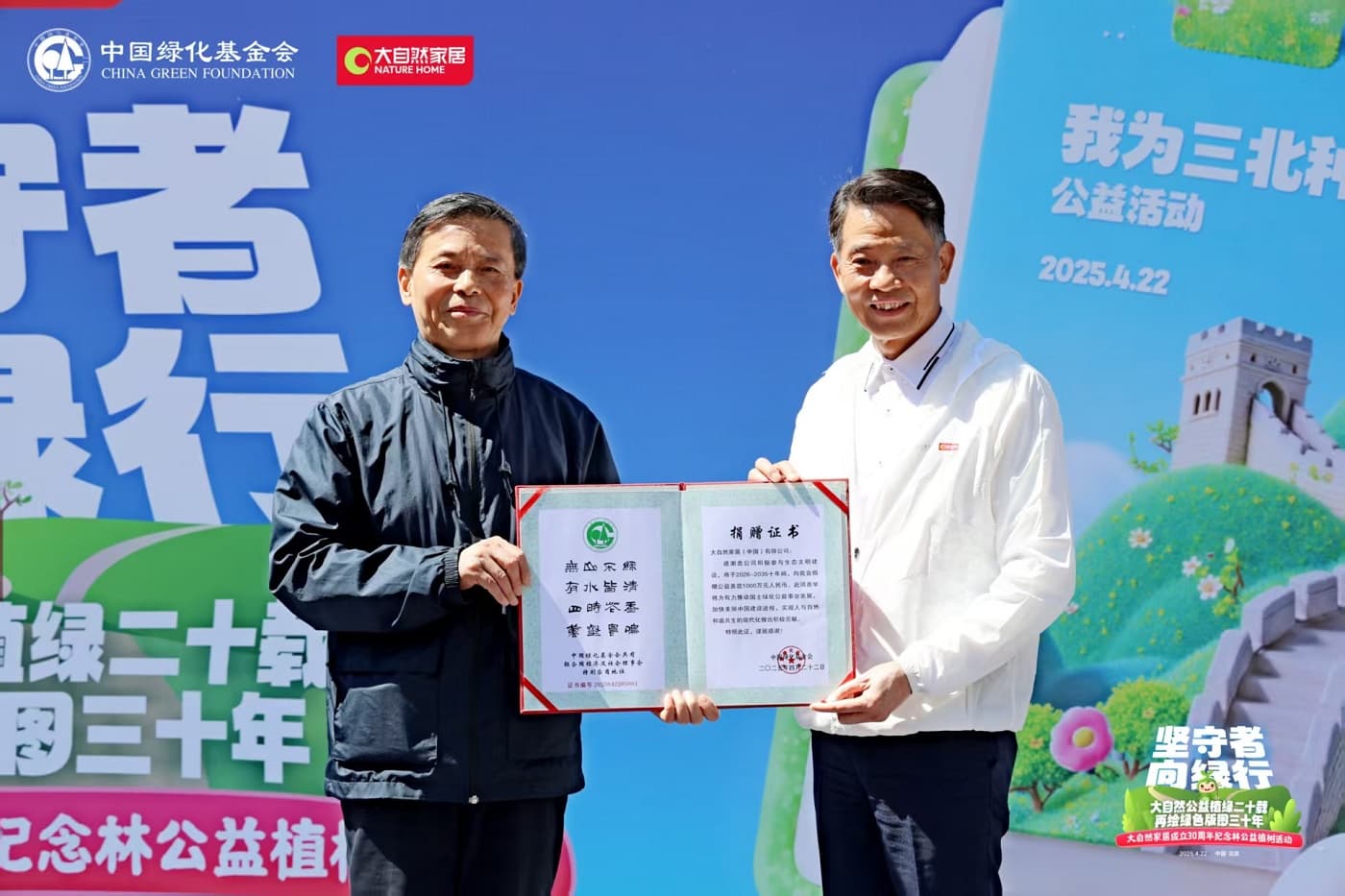 中國綠化基金會主席陳述賢與大自然家居董事長佘學彬共同啟動了“中國綠色版圖”第三個10年計劃。未來十年,大自然家居將繼續攜手中國綠化基金會,聚焦生態修復、城市碳中和林建設等生態工程,推動植樹行動從規?;炝窒蚓珳驶?、科學化生態治理轉型,助力國家“三北”防護林工程與碳中和目標。